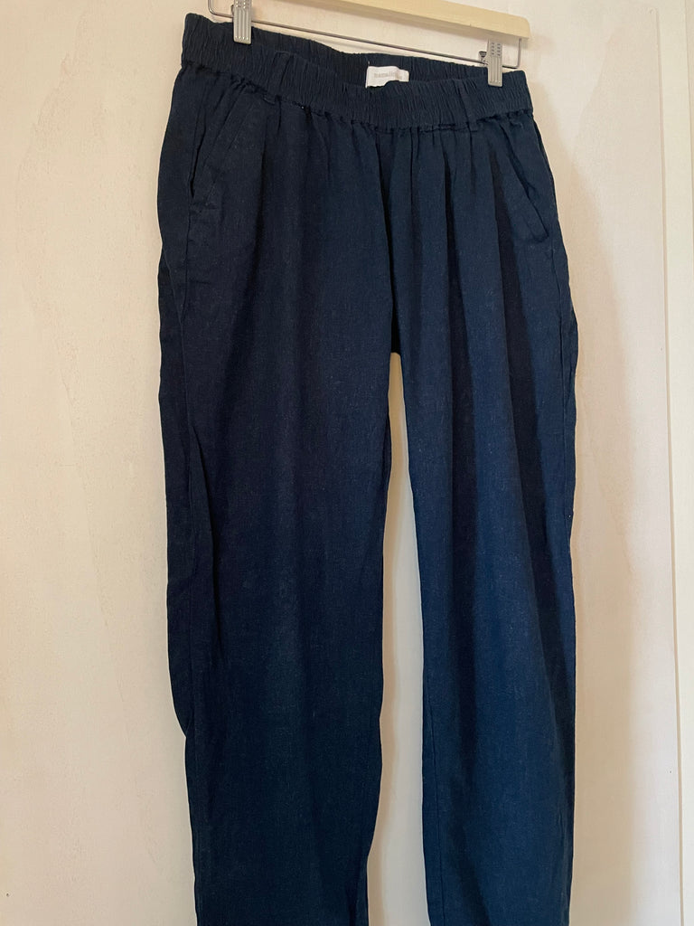 Blaue Leinenhose mit Vorder- und Gesässtaschen.