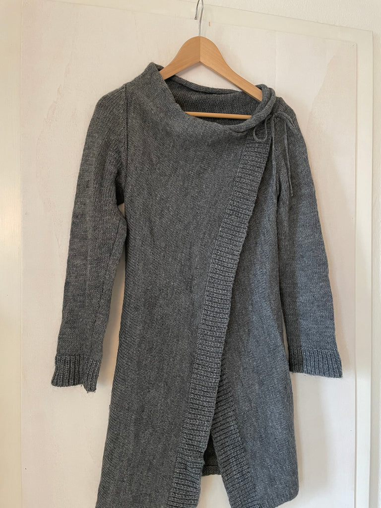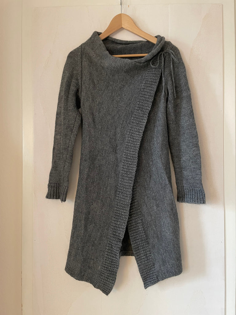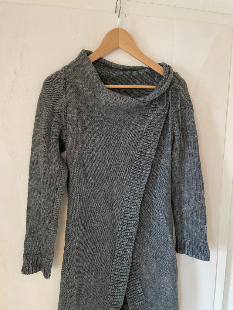 Graue Strickjacke.